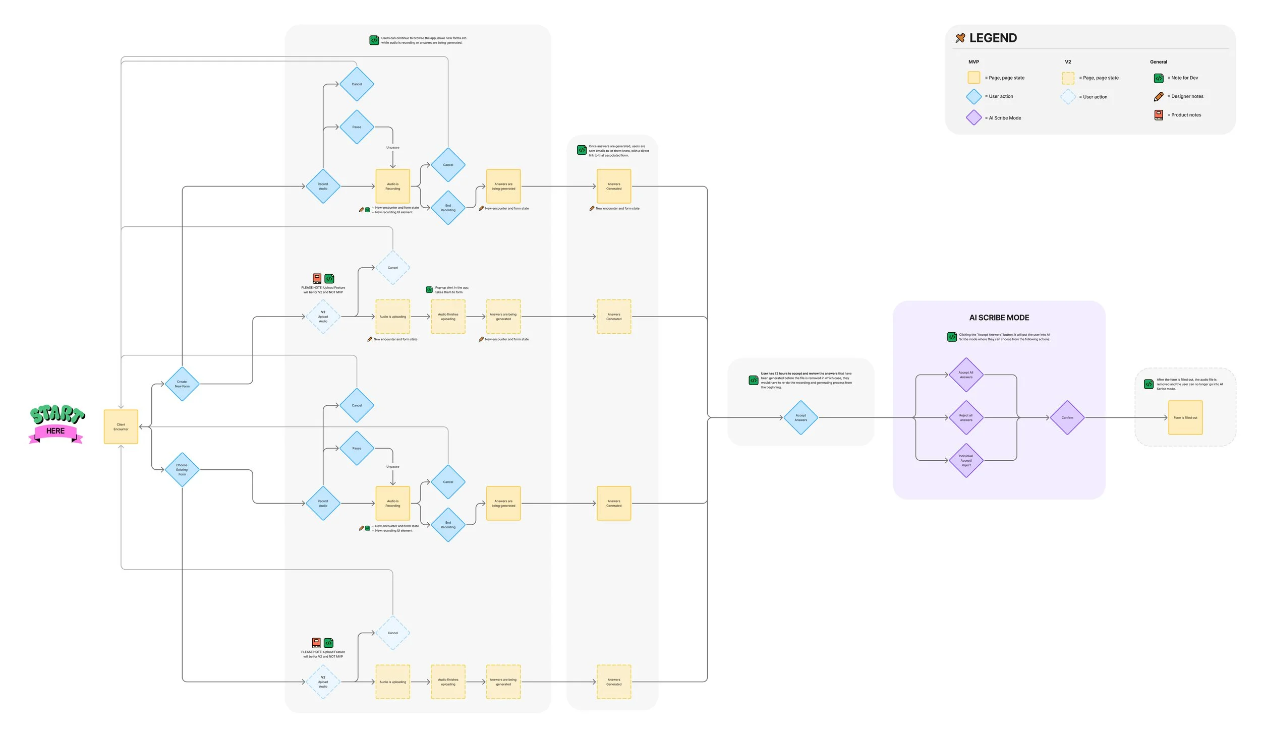 Based on key findings from the user-interviews, I worked on a user-flow for the MVP product which focuses on the ability to record audio which will then generate answers for the client form it is applied to. I collaborated with development and product to assure the user-flow reflected our goals and capabilities for MVP.